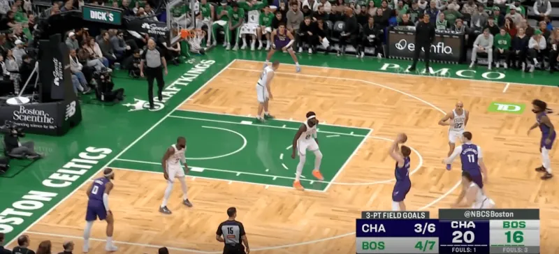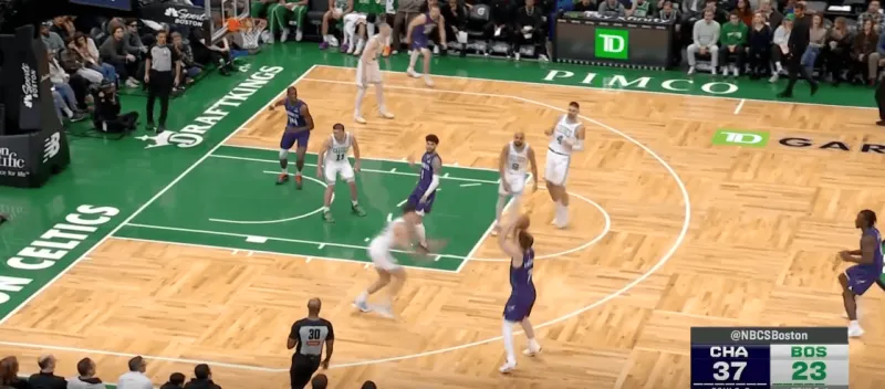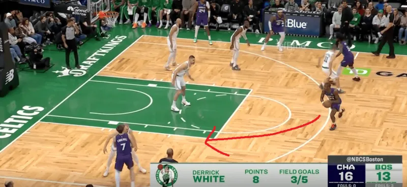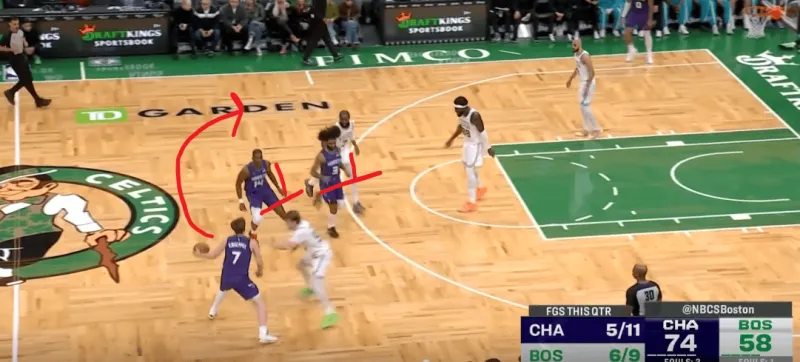 克尼普尔弧顶持球时,卡尔克布伦纳和科比-怀特同时提上打牛角发起,两个掩护方向供克尼普尔选择,在沃尔什的站位更靠上的情况下,克尼普尔选择走左侧惩罚没有提上的奎塔,从而获得三分出手的空位机会: