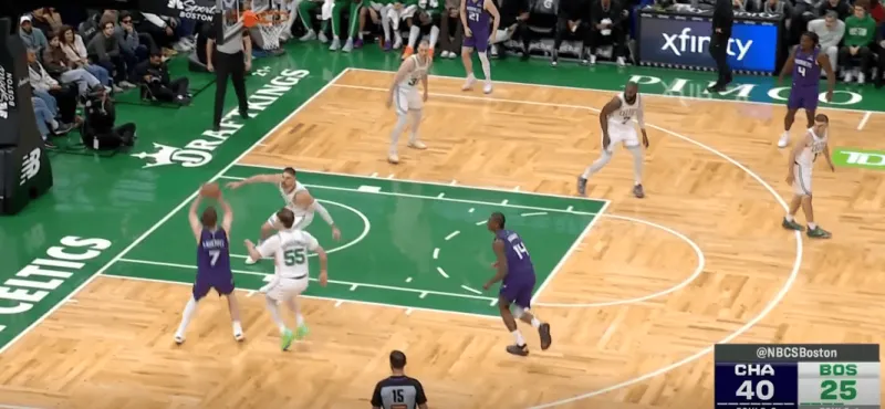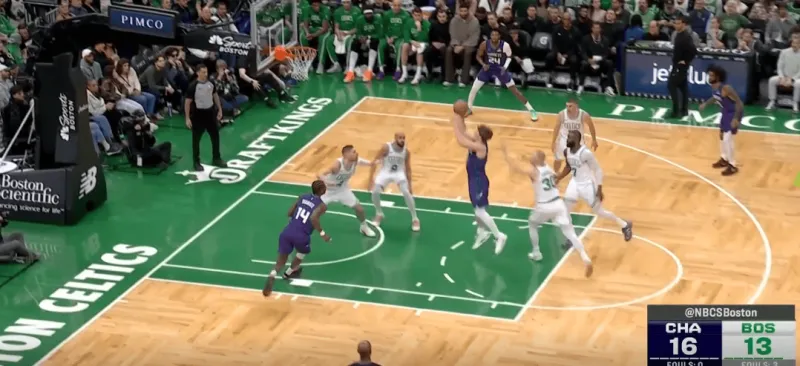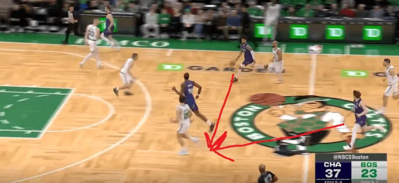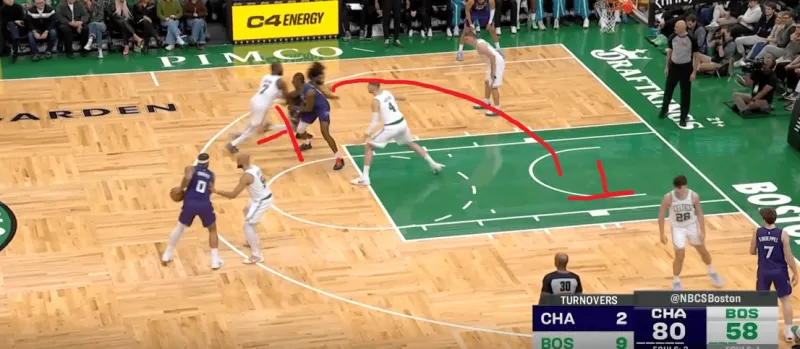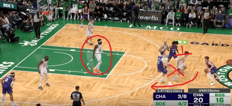 在手递手交球后,武切维奇在豪瑟已经身位落后的情况下,要同时处理克尼普尔的持球进攻和左侧迪亚巴特的快速顺下,而即使另一侧的怀特过来补防也为时已晚: