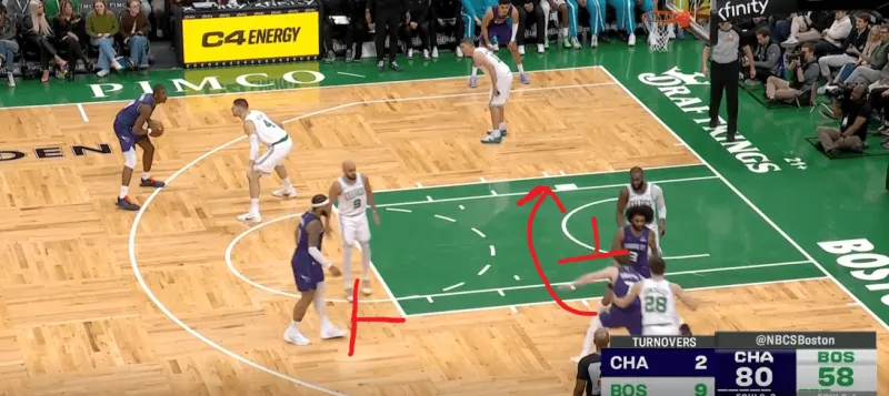无球端,黄蜂在转换时同时拥有布里奇斯、米勒等人的空手切入,也拥有三球的视野,在推进时已经向左侧观察克尼普尔,得益于迪亚巴特的快下吸引冈萨雷斯的跟防,克尼普尔跟进接球恰好有空位的机会: