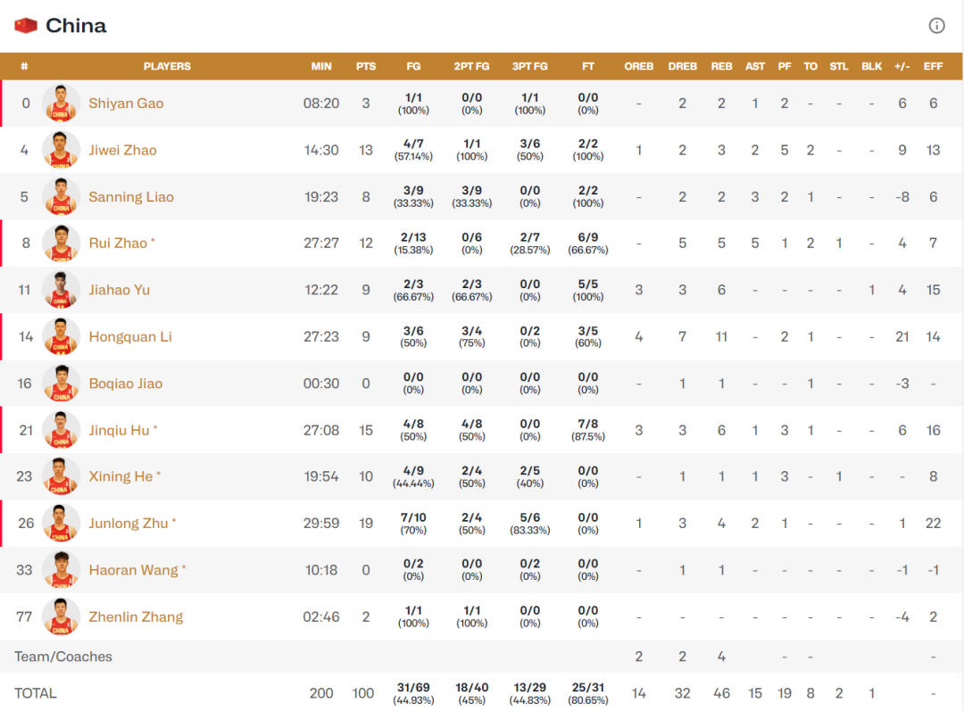 和上一场同日本的比赛一样,中国男篮再次体现出人多势众的优势,朱俊龙、胡金秋、赵继伟、赵睿、贺希宁5人得分上双,而第二次代表中国队出战的李弘权更成为篮板奇兵,一人抢下4攻7防11个篮板,率领全队在篮板球上以46比31大胜。而朱俊龙在三分线外6投5中砍下19分,带领全队打出44.83%的三分球命中率,压倒了同样手感火热、三分命中率高达40%的对手。