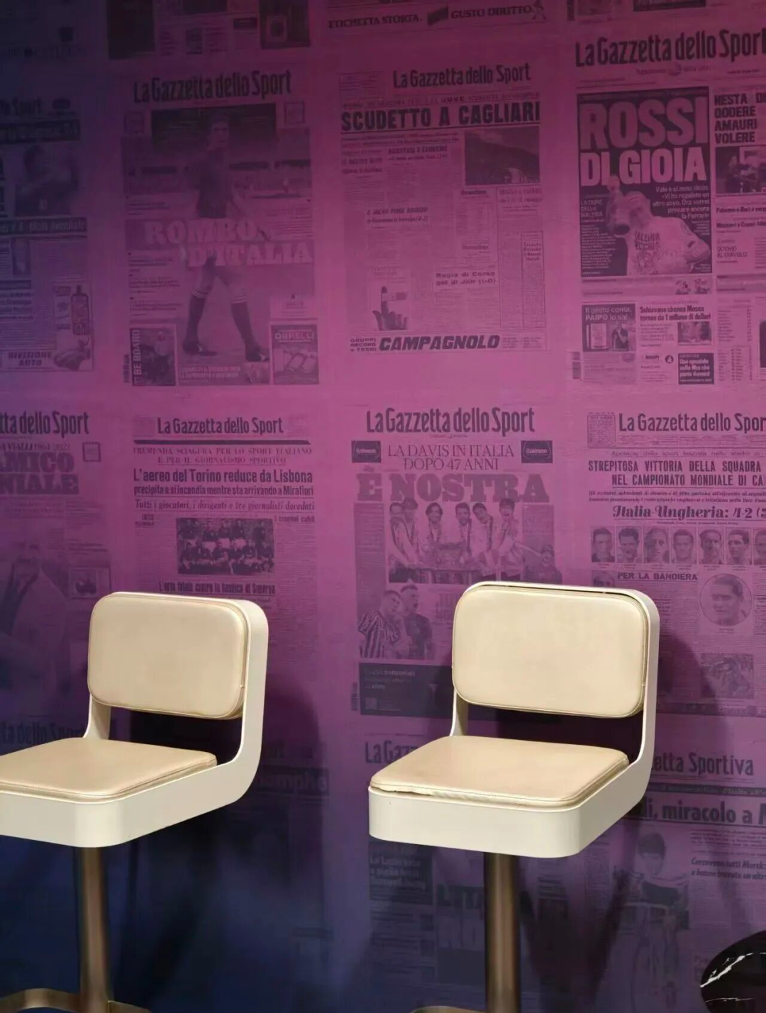 这间十平米多的演播室还有一个角落,可以用来录制快速访谈。其背景是淡紫色的墙纸,上面印的都是《米兰体育报》的封面,前面放了两张白色高脚椅。网站部的一个小哥掏出手机向我展示了耐克CEO埃利奥特-希尔造访《米兰体育报》并接受采访的视频。他就是坐在一张白色高脚椅上接受的访问。