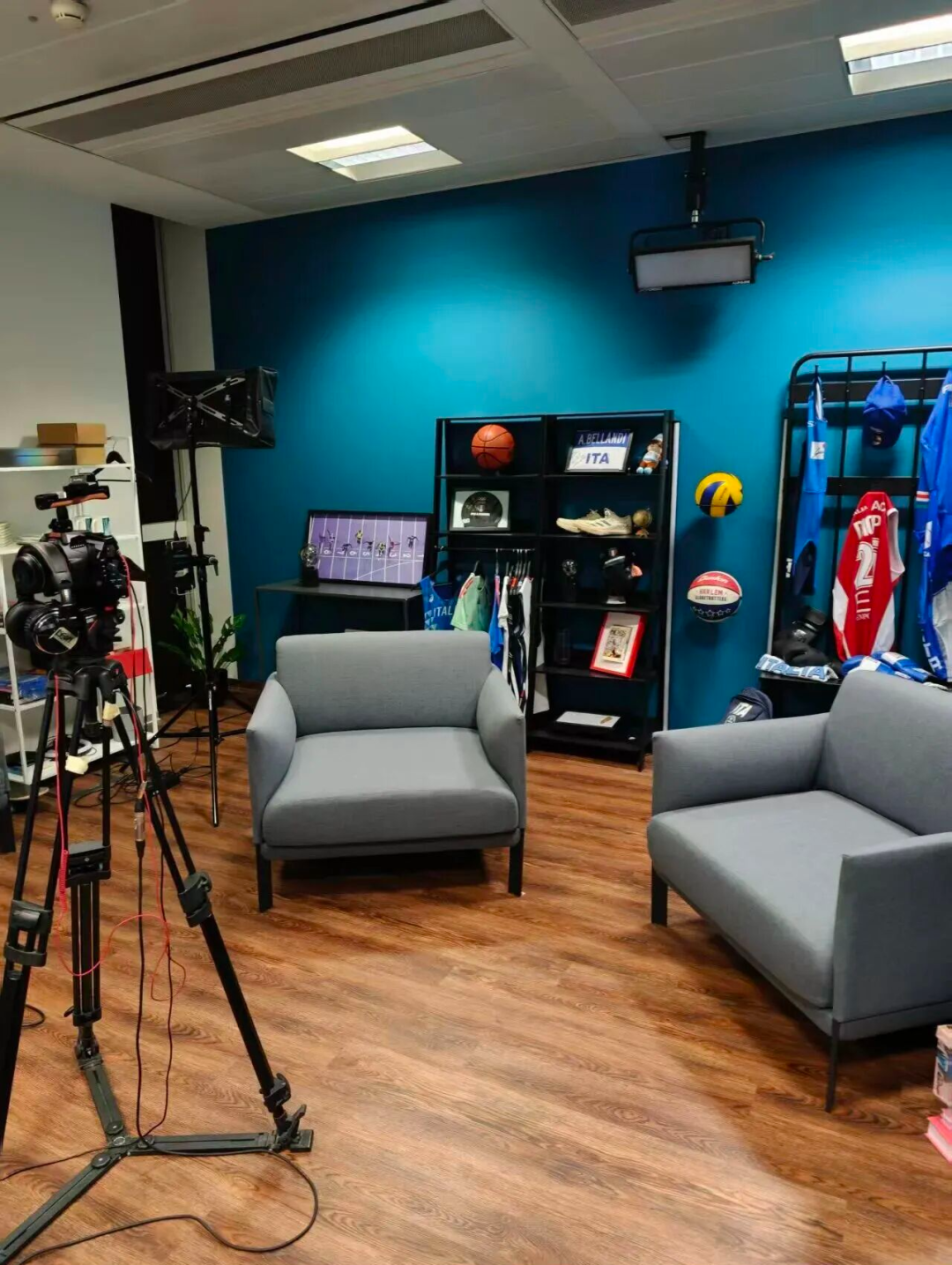 最核心的功能区设有两个单只沙发,背景也经过了精心的布置,陈列有球衣、足球、篮球、运动鞋、吉祥物等各种体育相关物品。这个区域主要负责录制人物专访。
